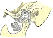 顎関節は、ただ蝶番(ちょうつがい)のように開け閉めするだけの単純なものではありません。下の図のように、頭の骨と顎の骨の間には「関節円板」という、コラーゲン繊維でできた軟骨のクッションが存在します。